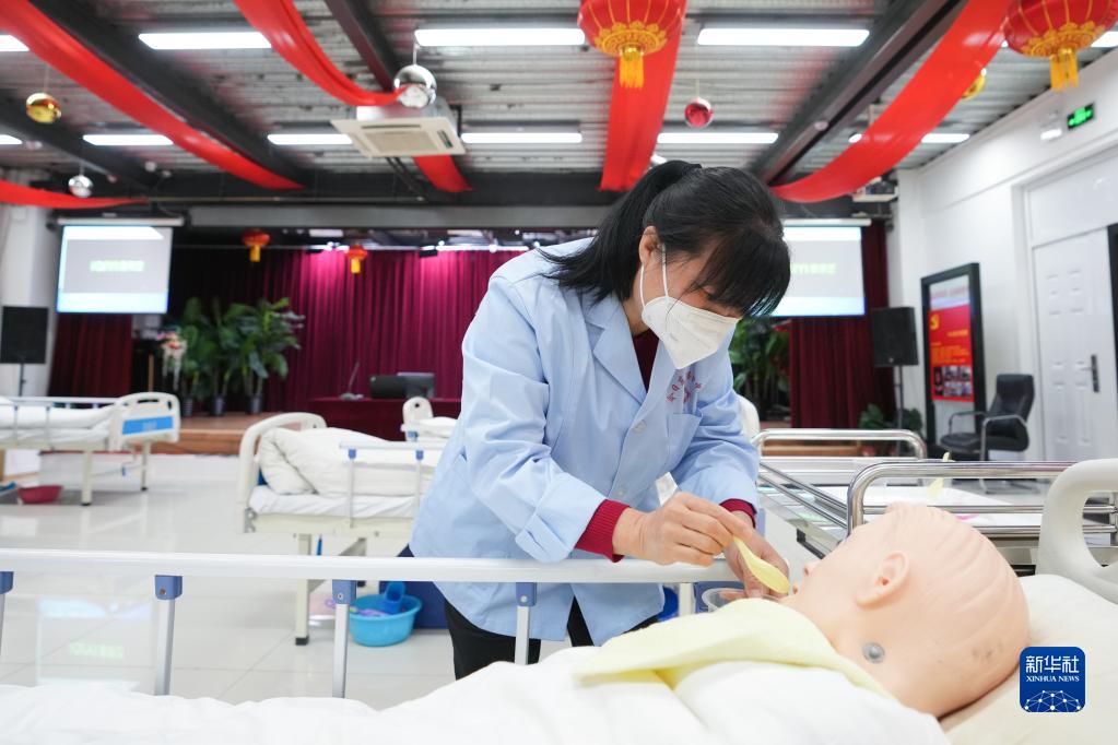 薛四四在北京市今日東方家政服務公司的護工崗前培訓上練習飲食照護操作(2月8日攝)。