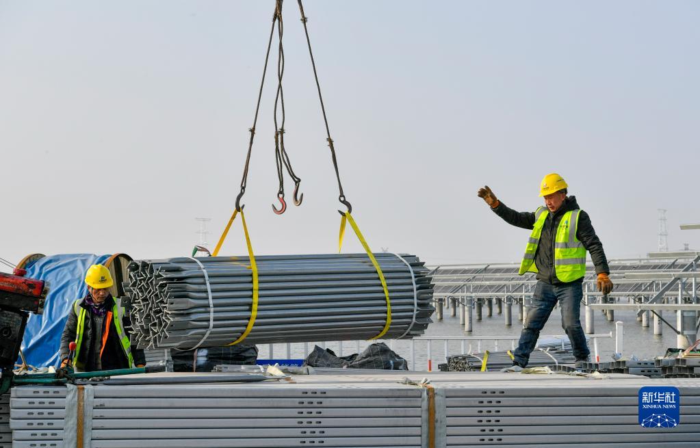 在天津濱海新區龍源海晶鹽光互補項目建設現場,建設者指揮吊運光伏板結構組件(2月7日攝)。
