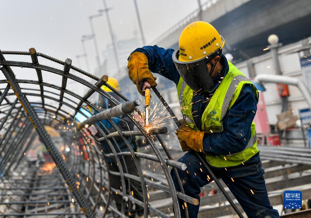 在天津地鐵8號(hào)線一期工程5標(biāo)項(xiàng)目南珠橋站施工現(xiàn)場(chǎng),建設(shè)者進(jìn)行焊接作業(yè)(2月11日攝)。