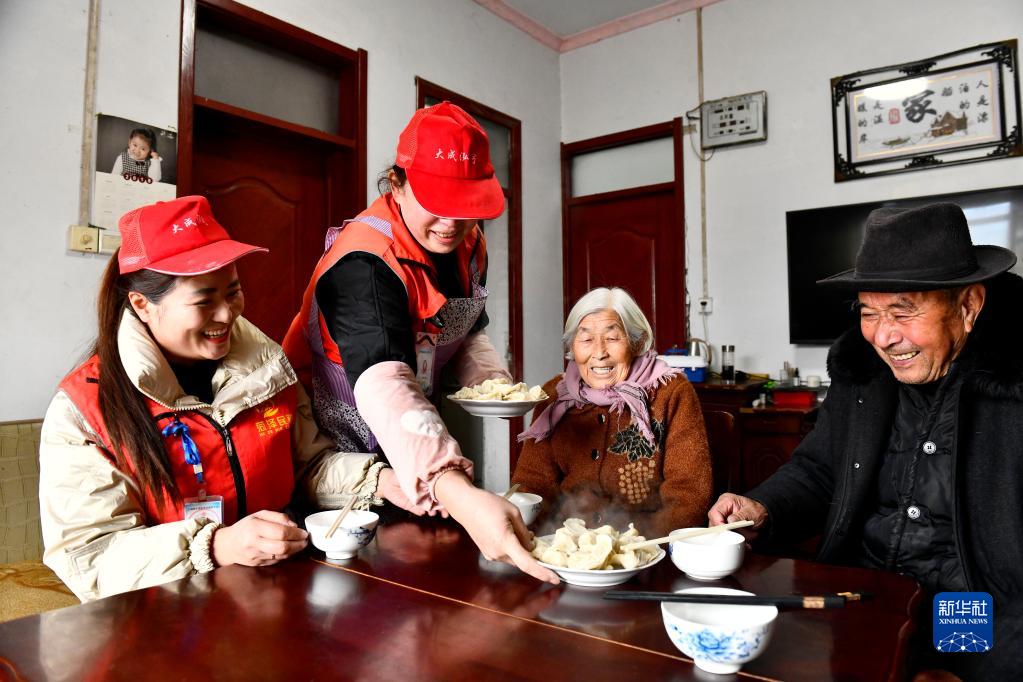 2月12日,在鄆城縣鄆州街道王沙灣村,鄆城縣居家養(yǎng)老服務(wù)中心的工作人員為魏金蘭(右二)、沈宜明(右一)端上餃子。