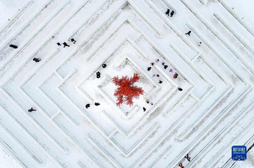 2月12日,游客在呼和浩特冰雪節(jié)冰雪景區(qū)感受冰雪迷宮樂趣(無人機(jī)照片)。