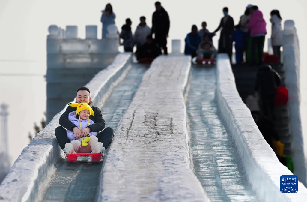 2月12日,游客在呼和浩特冰雪節(jié)冰雪景區(qū)體驗(yàn)冰滑梯。