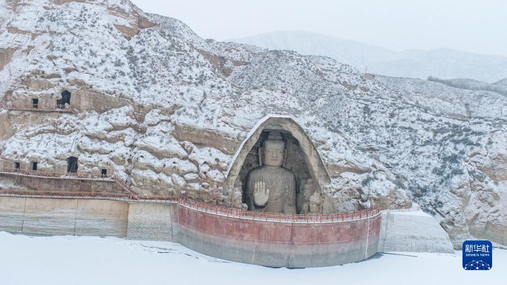 當日,位于甘肅省武威市涼州區的天梯山石窟迎來一場降雪。在皚皚白雪映襯下,窟區造像與原野山川構成一幅寧謐而優美的畫卷。