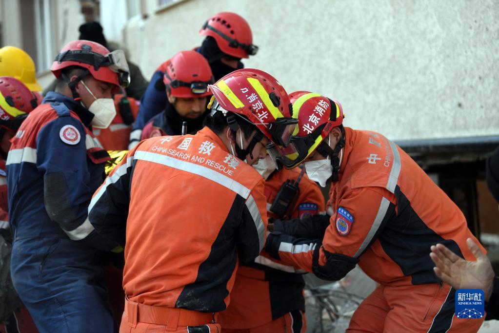 2月12日,在土耳其哈塔伊省安塔基亞市,中國救援隊(duì)轉(zhuǎn)移一名救出的幸存者。