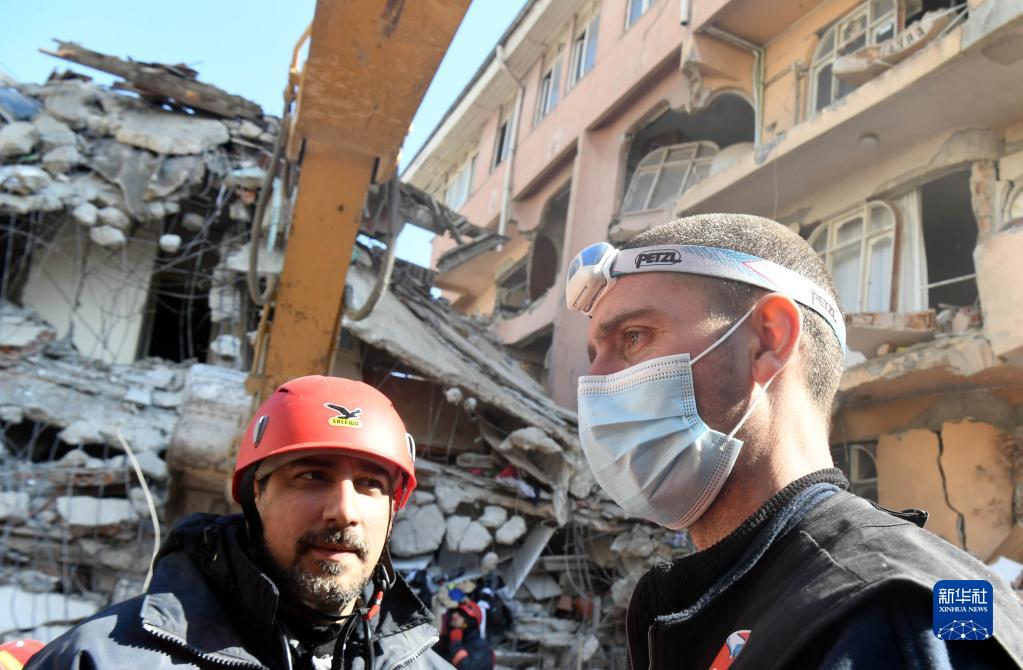 2月12日,救援人員在土耳其哈塔伊省安塔基亞市一處地震廢墟開展救援工作。
