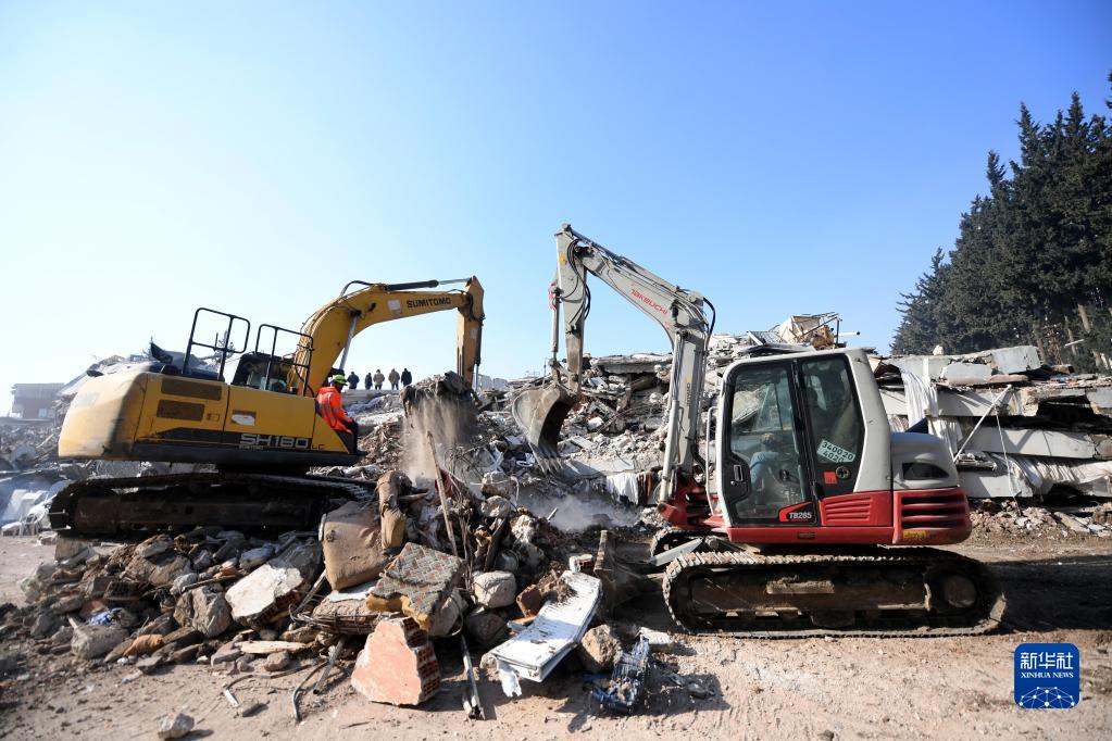 2月12日,大型機械在土耳其哈塔伊省安塔基亞市一處地震廢墟中作業。