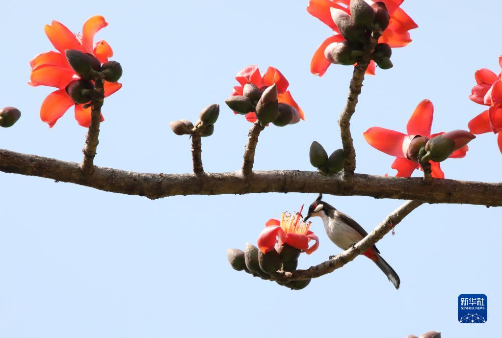 2月12日,鳥兒在云南省景洪市瀾滄江畔的木棉樹枝頭吸食花蜜。