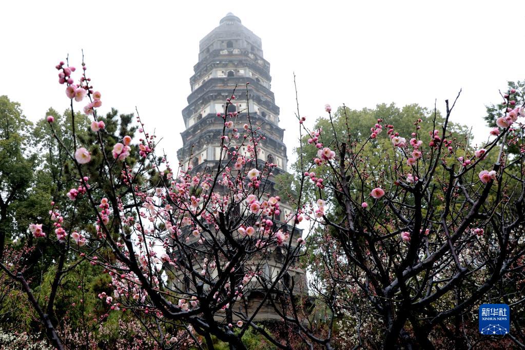 2月12日,蘇州虎丘山景區綻放梅花與古塔相映成景。