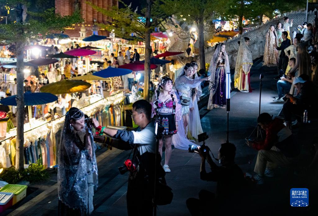 夜幕降臨,位于云南省西雙版納傣族自治州景洪市的告莊西雙景星光夜市流光溢彩,游人如織。富有民族風情的旅拍受到游客青睞,成為熱門體驗項目,拉動城市“夜經(jīng)濟”發(fā)展。