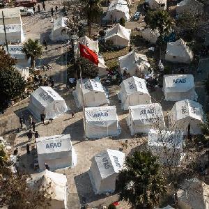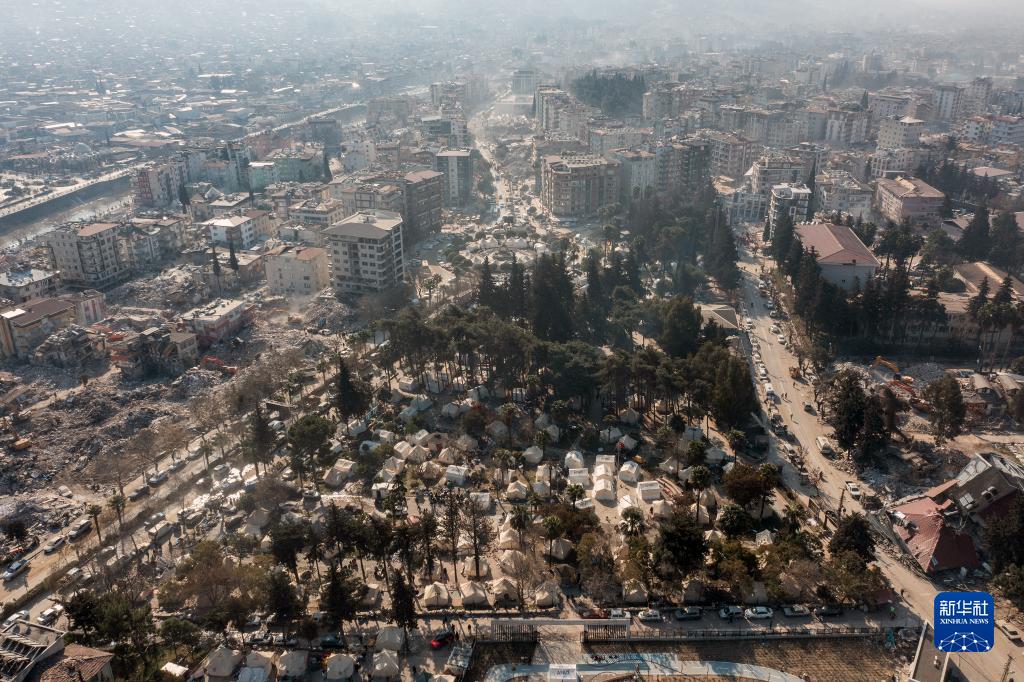 這是2月12日在土耳其哈塔伊省安塔基亞市中心拍攝的地震廢墟和救援帳篷(無人機(jī)照片)。