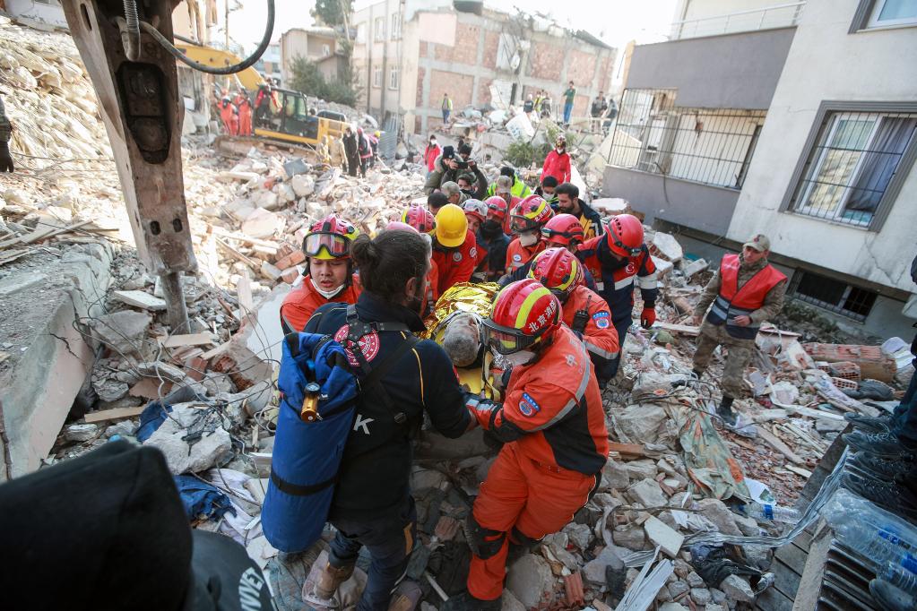 2月12日,在土耳其哈塔伊省安塔基亞市,中土兩國救援隊隊員轉移一名救出的幸存者。