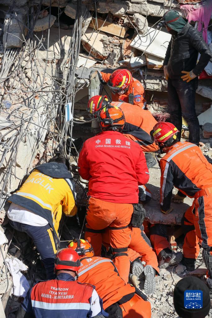 2月12日,在土耳其哈塔伊省安塔基亞市,中土兩國救援隊隊員在地震廢墟中搜救。