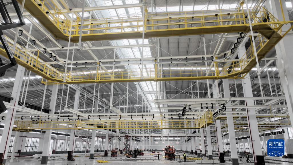 2月12日,德清縣雷甸鎮(zhèn)一家高空作業(yè)機械生產(chǎn)企業(yè)“未來工廠”車間,工人在安裝智能化生產(chǎn)線設備(無人機照片)。