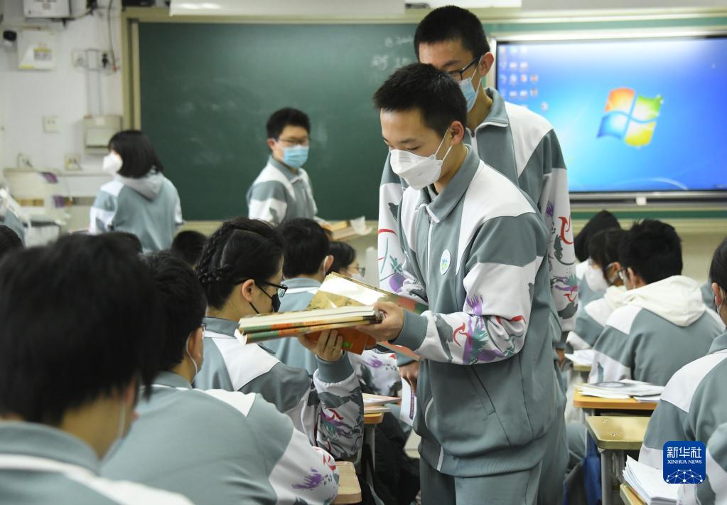 2月13日,在北京市中關村中學知春分校高一(1)班,學生在分發新學期教材。