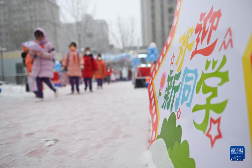 當日,青海省西寧市的小學生迎來開學首日,孩子們在降雪中開啟新學期。