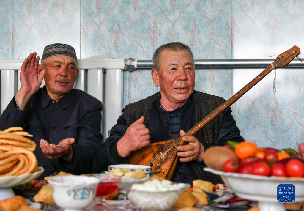 在一次鄰里聚會(huì)上,巴爾魯克山區(qū)牧民木拉提(右)即興彈唱歌曲,身邊的朋友沉醉其中,打著節(jié)拍(2月12日攝)。