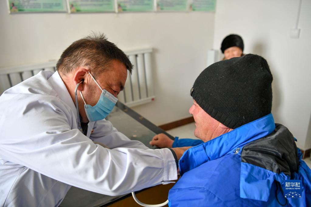 新疆裕民縣牧業醫院醫生葉爾江·庫坎(左)為牧民檢查身體(2月12日攝)。為方便牧民,牧業醫院會定期開展上門巡回診療,送健康上門。