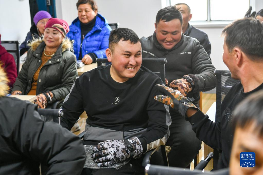 在新疆裕民縣巴爾魯克牧業(yè)幸福驛站的小教室,牧民阿依巴爾·阿斯哈爾(中)參與知識(shí)問(wèn)答后,獲得一副手套作為獎(jiǎng)品(2月9日攝)。