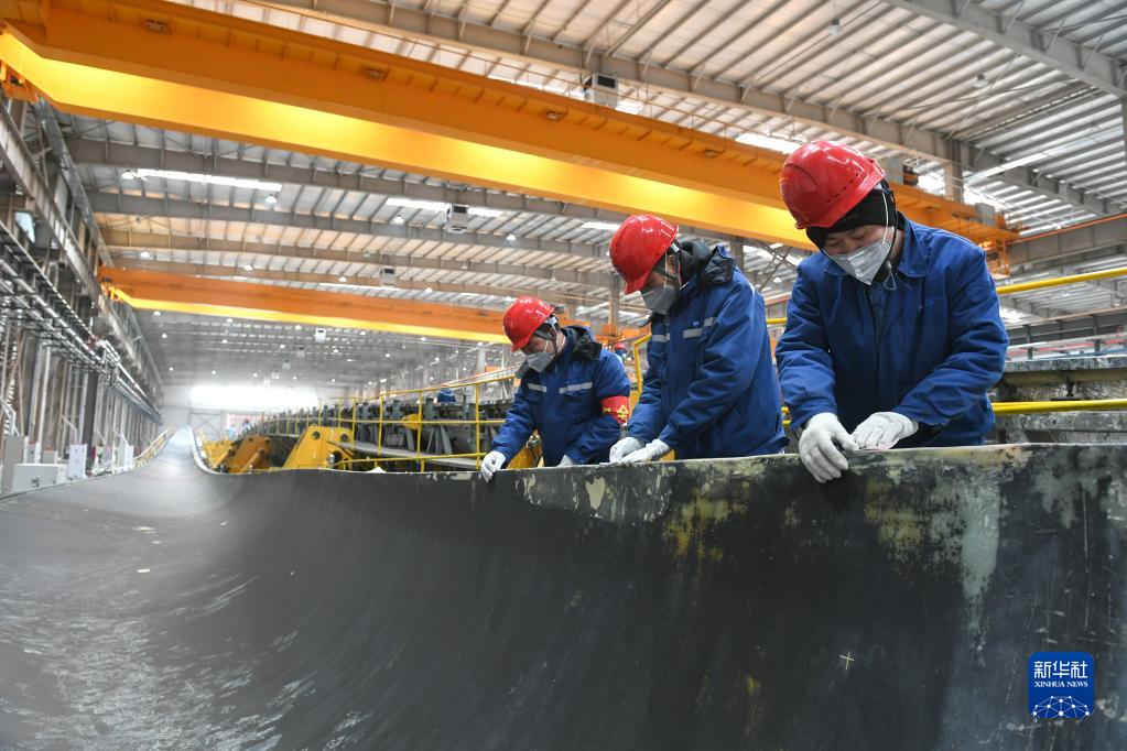 2月13日,工人在內(nèi)蒙古包頭市明陽(yáng)新能源裝備智能制造產(chǎn)業(yè)園風(fēng)力發(fā)電葉片生產(chǎn)車(chē)間內(nèi)作業(yè)。