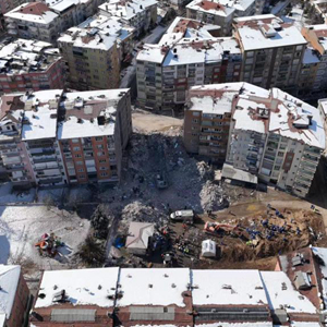 2月13日,在土耳其馬拉蒂亞,中國藍天救援隊隊員與當地救援人員在一處廢墟合作開展地震救援工作。