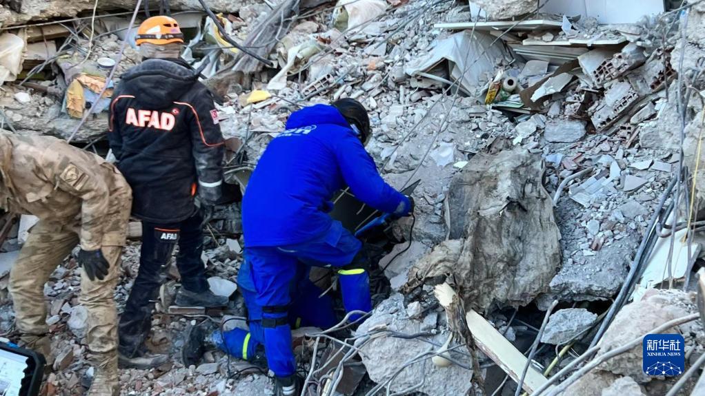2月13日,在土耳其馬拉蒂亞,中國藍天救援隊隊員與當地救援人員在一處廢墟合作開展地震救援工作。
