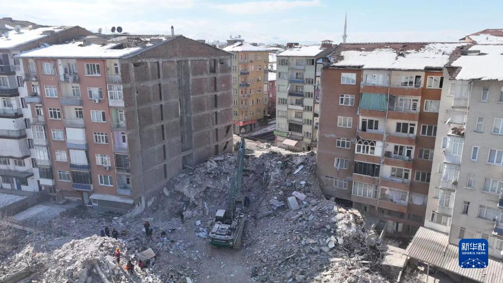 2月13日,在土耳其馬拉蒂亞,中國藍天救援隊隊員與當地救援人員在一處廢墟合作開展地震救援工作。