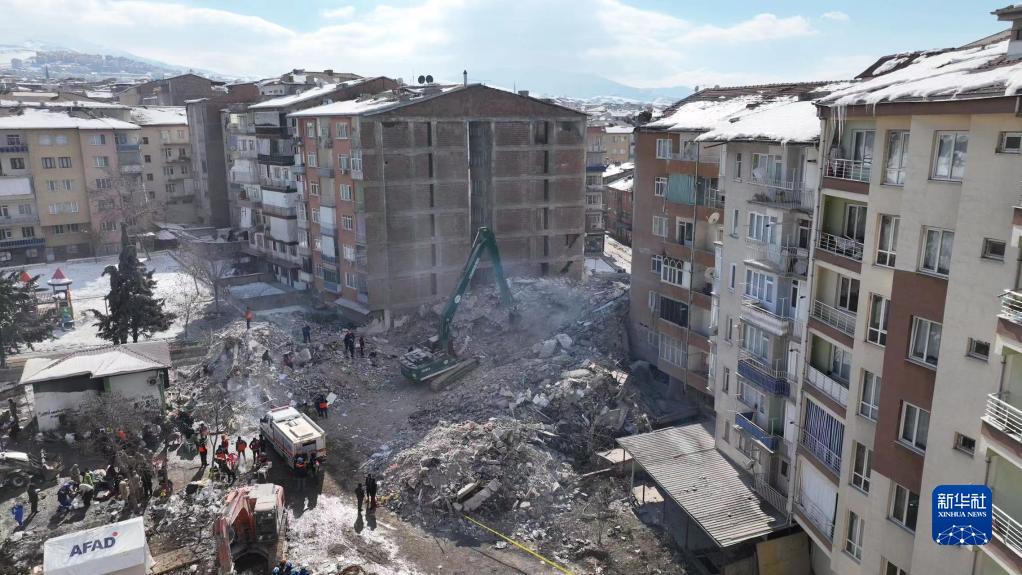 2月13日,在土耳其馬拉蒂亞,中國藍天救援隊隊員與當地救援人員在一處廢墟合作開展地震救援工作。