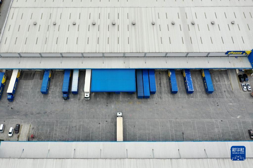 2月13日,快遞運送貨車停靠在貴州快遞物流園內(無人機照片)。