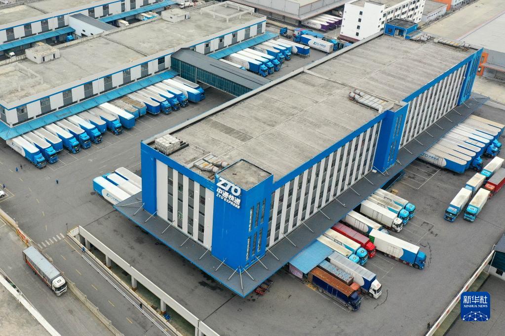 2月13日,快遞運送貨車停靠在貴州快遞物流園內(無人機照片)。