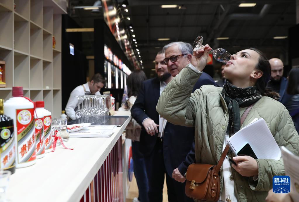 2月13日,嘉賓在法國巴黎國際葡萄酒及烈酒博覽會上品嘗貴州茅臺酒。