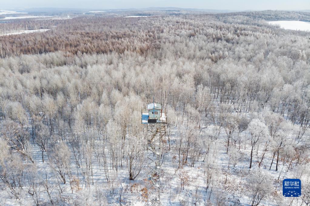 位于黑龍江省黑河市的黑龍江省沾河林業(yè)局有限公司施業(yè)區(qū)內(nèi)的防火瞭望塔與霧凇景觀(2月13日攝,無人機照片)。