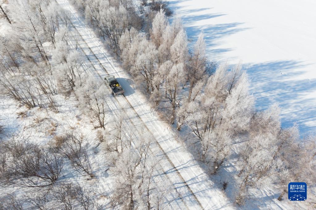 黑龍江省黑河市五大連池市龍鎮(zhèn)附近的霧凇景觀(2月13日攝,無(wú)人機(jī)照片)。