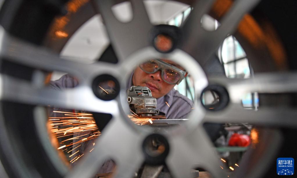 2月13日,浙江省臺州市仙居縣一車業公司車間,工人進行汽車零配件打磨作業。
