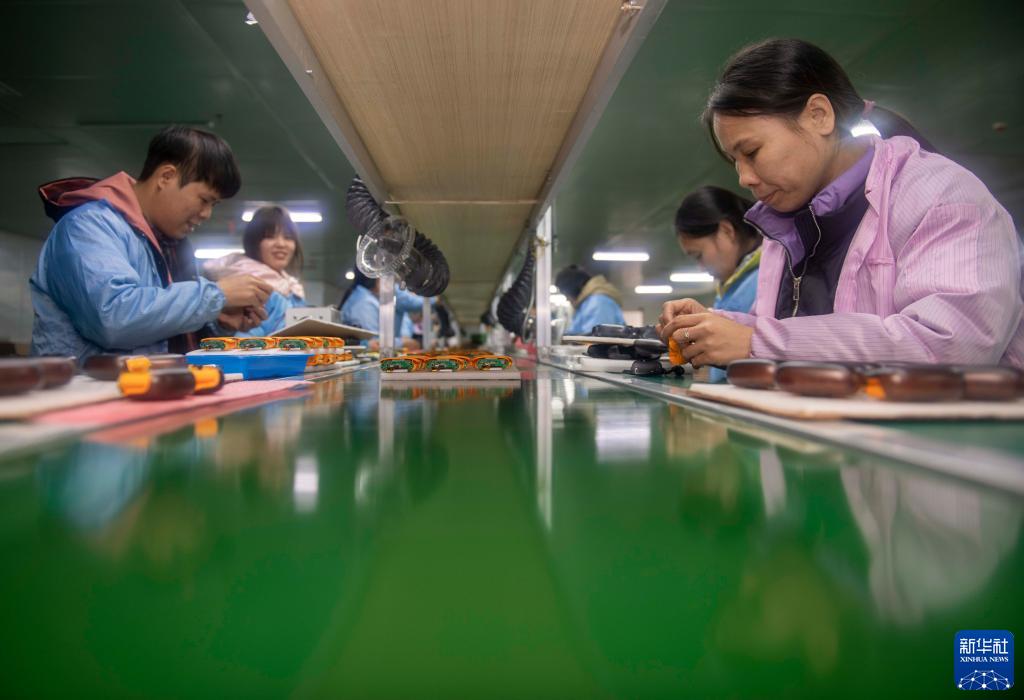 2月13日,在湖南省永州市道縣高新技術產業開發區一電子公司,工人在流水線上忙碌。