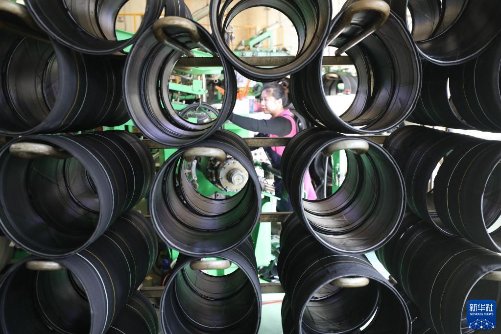 2月13日,山東省臨沂市沂南縣,一科技公司員工在生產出口東南亞的輪胎。