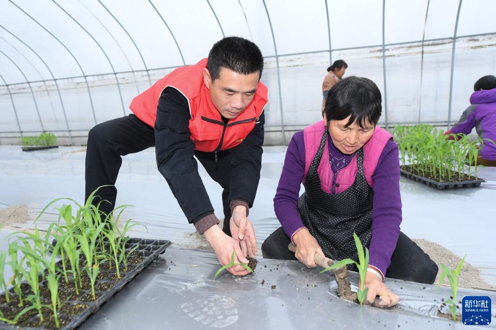 2月14日,在航頭鎮航川村,黨員志愿者在大棚內幫助農戶種植玉米秧。