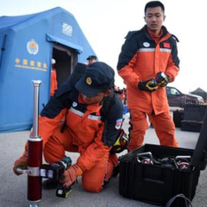 2月11日,在位于土耳其哈塔伊省哈塔伊體育館外的中國救援隊營地,救援隊隊員檢查設備。
