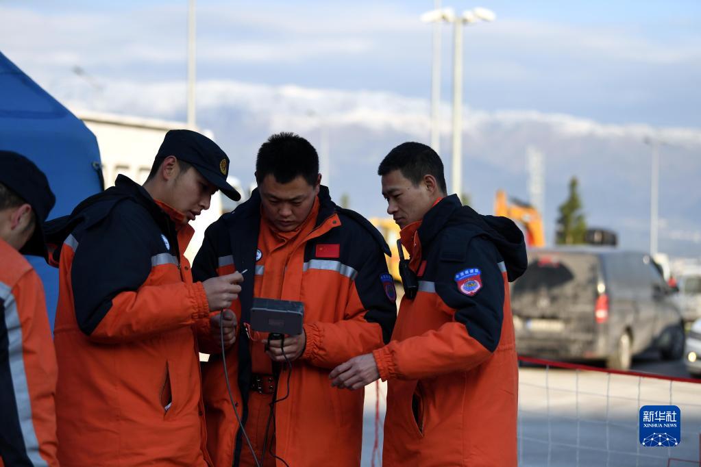 2月11日,在位于土耳其哈塔伊省哈塔伊體育館外的中國(guó)救援隊(duì)營(yíng)地,救援隊(duì)隊(duì)員檢查設(shè)備。
