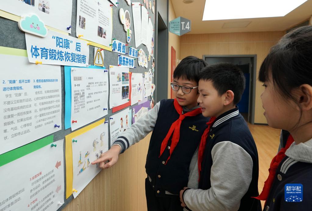 2月13日,在上海市長寧區(qū)天山第一小學(xué),返校學(xué)生在走廊閱讀新學(xué)期體育鍛煉指南。