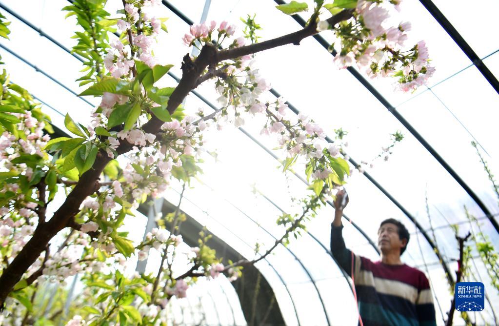 2月14日,石家莊市贊皇縣黃家溝櫻桃種植基地,果農(nóng)進(jìn)行人工授粉。
