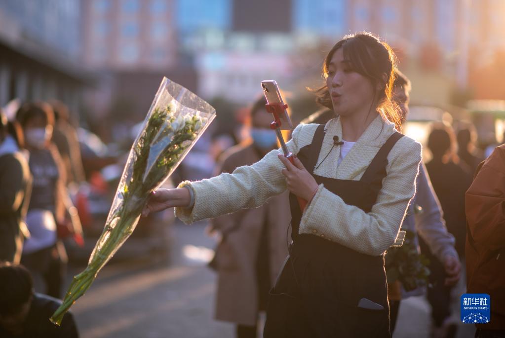 主播畢茜茜在斗南花卉交易市場為顧客介紹鮮切花(2月13日攝)。