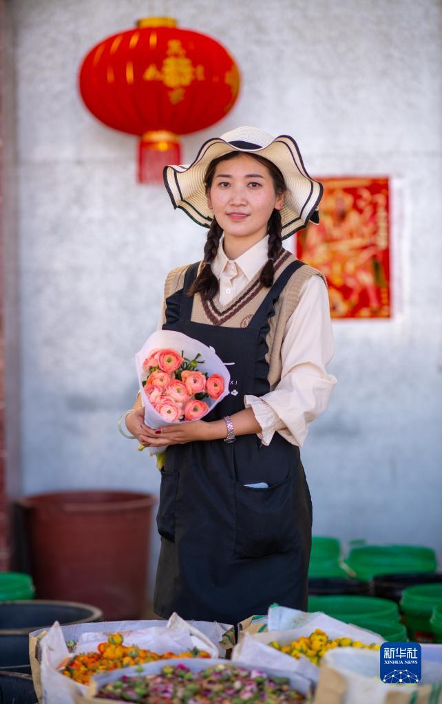 主播畢茜茜展示自家出產的鮮花(2月12日攝)。