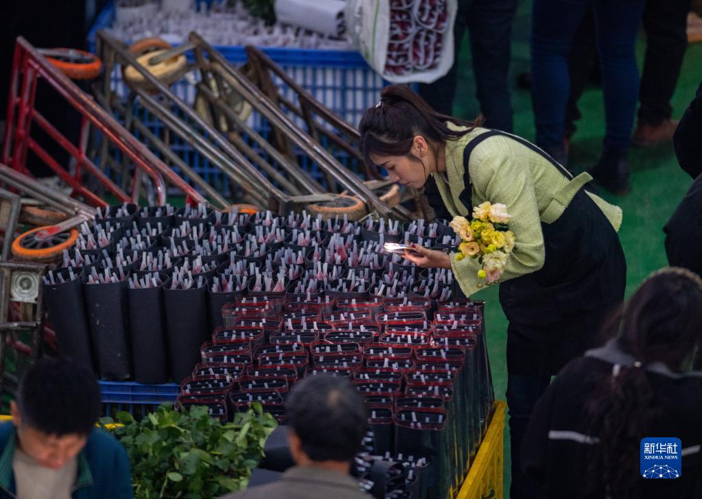 主播畢茜茜在斗南花卉交易市場(chǎng)直播(2月13日攝)。