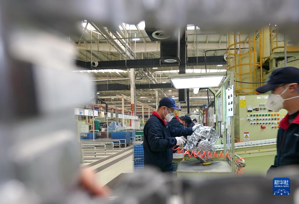 2月14日,工人在唐山市豐潤區一家汽車變速箱制造企業的生產線上工作。