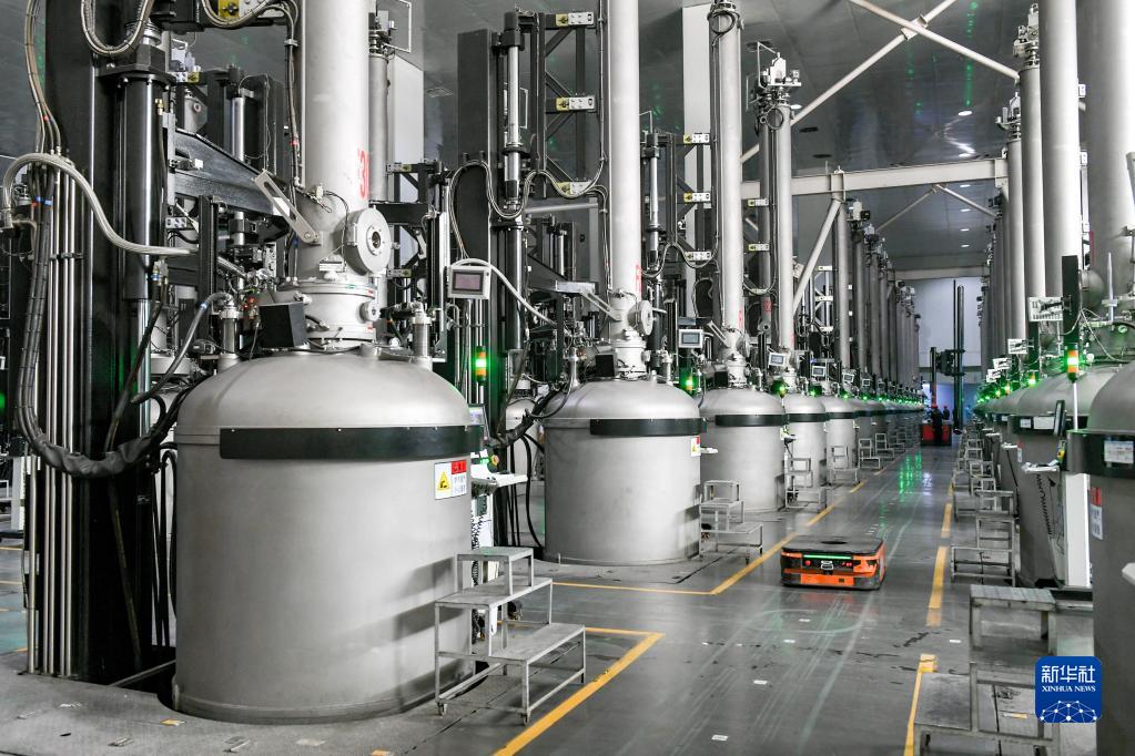 2月14日拍攝的包頭一家硅材料生產企業的單晶硅棒生產車間。