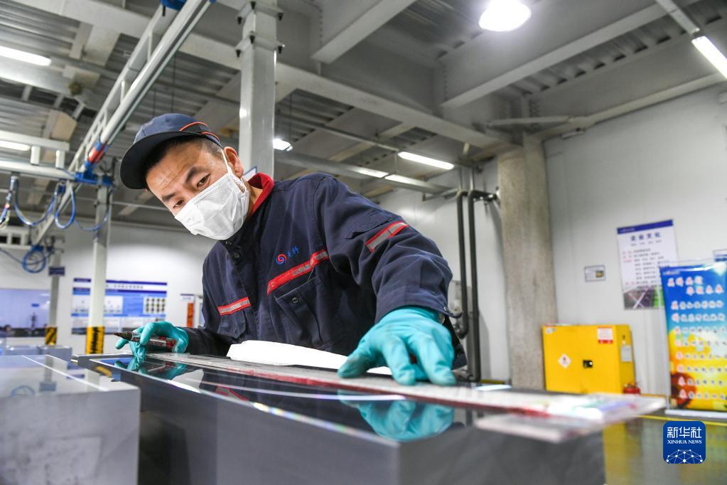 2月14日,包頭一家硅材料生產企業的工人在車間測量單晶硅體尺寸。
