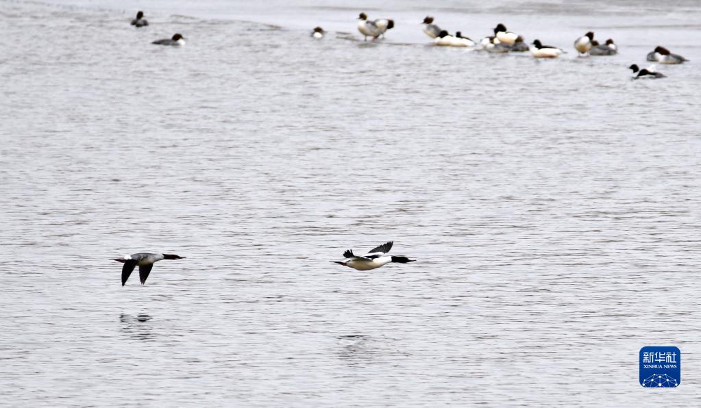 各種鳥類在北京園博湖上棲息、飛翔(2月14日攝)。