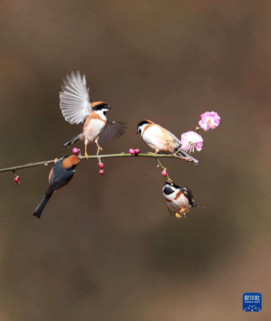 近日,江蘇鎮江西山水庫附近山花開放,吸引紅頭長尾山雀前來覓食小憩。