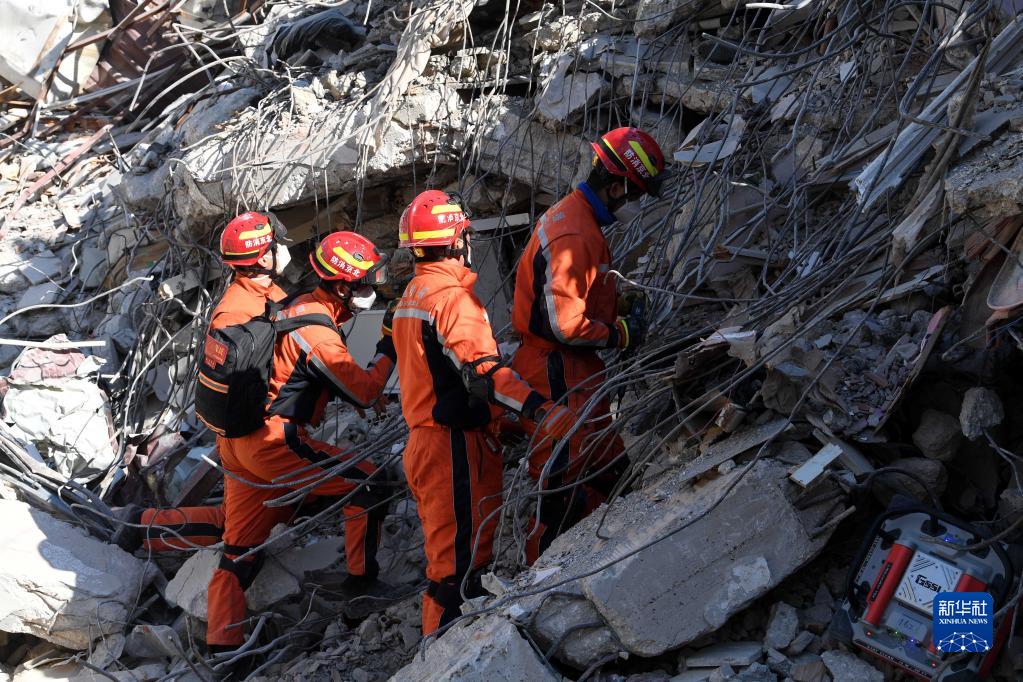 2月14日,在土耳其哈塔伊省安塔基亞市,中國救援隊隊員在地震廢墟中搜救。