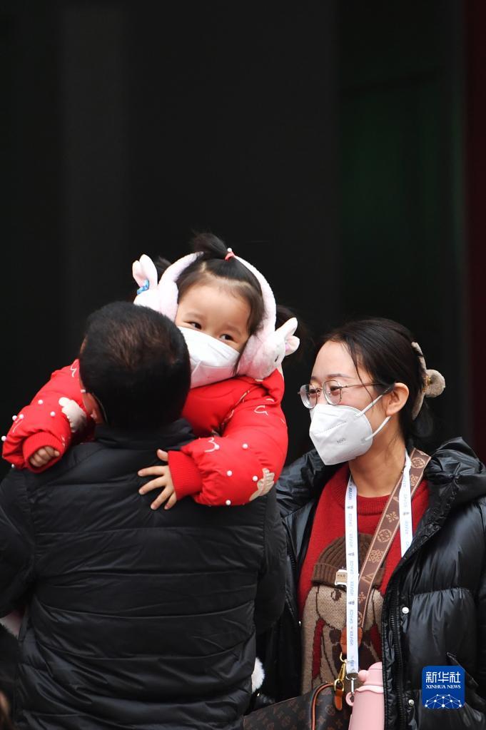 1月16日,在蘭州火車站西出站口,從烏魯木齊回家過年的姚女士(右一)帶著孩子與前來接站的家人團聚。